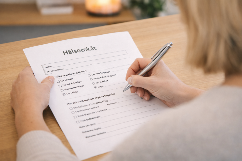 Den innehåller frågor om dina besvär, hur de påverkar ditt liv och din tidigare sjukdomshistoria.