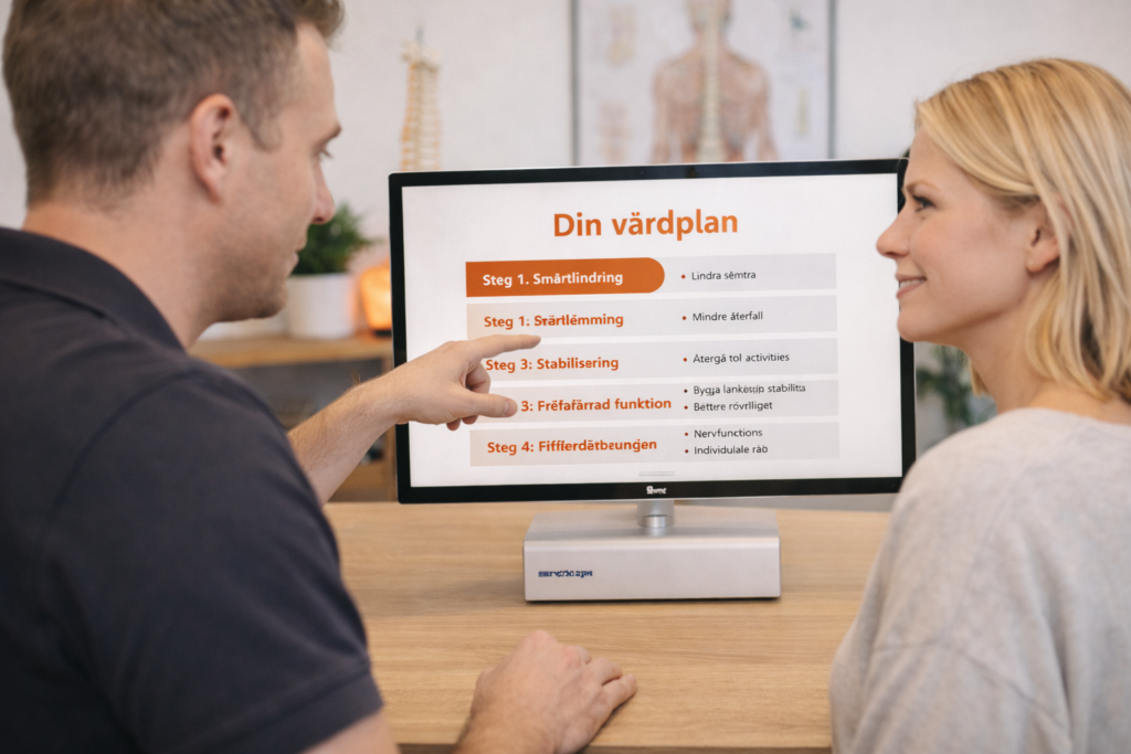 Efter videon följer ett samtal med kiropraktorn där vi går igenom dina besvär mer i detalj.